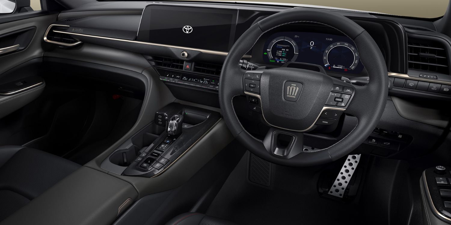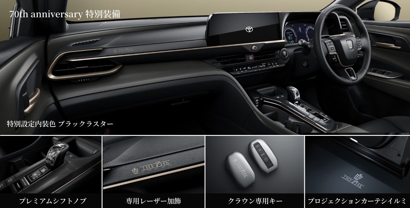 室内には、特別設定色「ブラックラスター」を採用し、落ち着きと上質感を両立したインテリア空間を演出。運転席には70周年を記念したロゴ入りシフトノブや、専用レーザー加飾のインストルメントパネル、記念ロゴを刻んだクラウン専用キーを装備。さらに、プロジェクションカーテシイルミやリサイクルレザーを使用したマニュアルケースなど、特別仕様車ならではのこだわりが随所に息づいています。