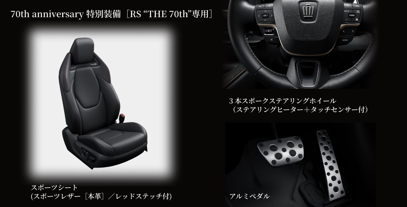 特別仕様車「RS “THE 70th”」だけに与えられた、走りへのこだわりを象徴する専用装備。緻密に調整されたホールド性能を誇るスポーツシートが、ドライバーとクルマの一体感を高め、よりダイナミックなドライビングを実現します。さらに、上質な本革巻きの専用ステアリングホイールに、ヒーターとタッチセンサー機能を装備。足元にはアルミペダルを採用し、操作するたびに高揚感をもたらす、RS専用のスポーティな空間に仕上げています。