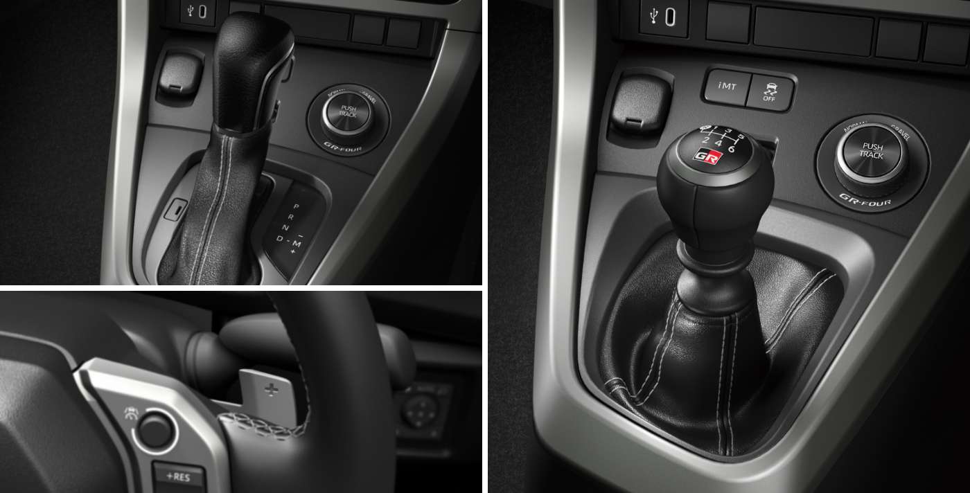 GAZOO Racing Direct Automatic Transmission(GR-DAT)+パドルシフトは、ラリー・ダートトライアルからのフィードバックを織り込み、操作しやすく、ステアリングからすぐリーチできる位置になるように開発し、6MTモデルと同等の操作性を確保。また、Mモードでの変速操作の向きを、押し操作でシフトダウン(減速)、引き操作でシフトアップ(加速)に変更し、車両挙動に合わせたシフトダウン&シフトアップができる向きにすることで、レーシングカーのシーケンシャルトランスミッションのような操作を可能にしました。6速マニュアル車は本革巻きシフトノブ+シフトレバーブーツ(合成皮革/ステッチ付)を理想的な位置に配置し、各部品の諸元・特性を専用にチューニング。ショートストロークで剛性感のあるシフトフィールを実現しています。 [RZ “High performance” + Aero performance package、RZ“High performance”、RZに標準装備]