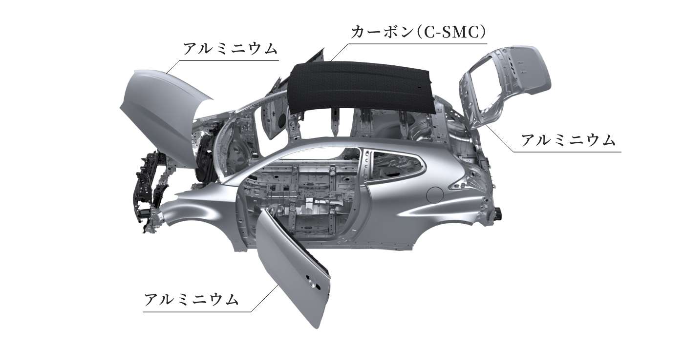 フロントフードやドア、バックドアにはアルミ素材が使用され、軽量化を実現。また、ルーフには新工法のC-SMCを採用し、炭素繊維と樹脂を用いたシート状の材料で複雑な成形を可能にし、スポーツ走行に直結する大幅な軽量化と低重心化を達成しています。従来モデルよりもホイールハウスやピラー、バックドア開口部まわりに専用の骨格構造を与えることで結合剛性を高め、優れたねじり剛性を確保しています。