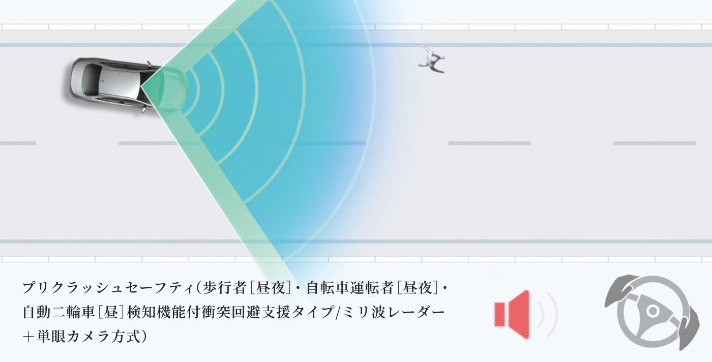 ミリ波レーダーと単眼カメラを使って車両や歩行者、自転車運転者、自動二輪車を検出し、衝突の可能性を警報で通知。ブレーキ操作があればプリクラッシュブレーキアシスト、未操作の場合はプリクラッシュブレーキが作動し、衝突回避をサポートします。緊急時操舵支援機能では、回避操舵時に車両安定性と車線逸脱抑制をサポート。低速時加速抑制機能は、前方の障害物に対して過剰なアクセル操作を抑制し、衝突回避を助けます。