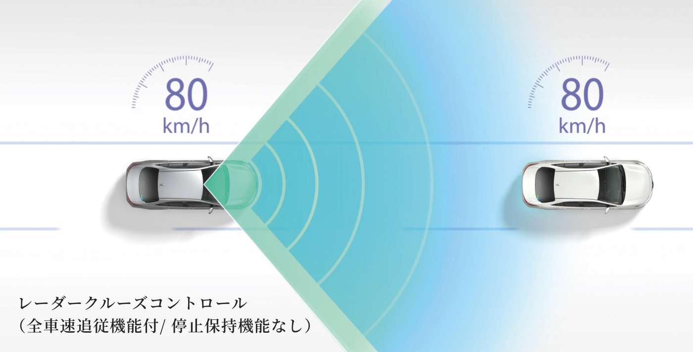 ミリ波レーダーと単眼カメラで先行車を認識し、車速に応じた車間距離を保ちながら追従走行を支援します。「全車速追従機能付/停止保持機能なし」は先行車が停止したときは自車も停止。停止後、システムを解除します。 [レーダークルーズコントロール(全車速追従機能付/停止保持機能なし)は、GR-DAT(8AT)に標準装備]